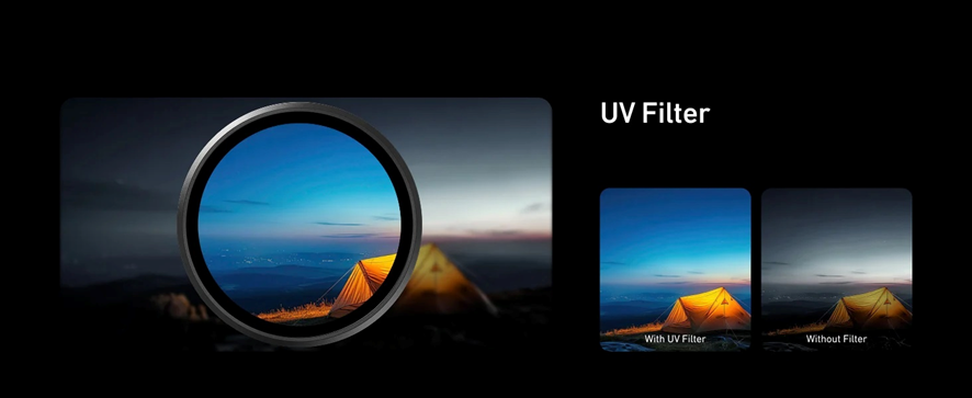 O filtro UV reduz o efeito azulado e melhora a nitidez geral, além de proteger a lente no uso diário.